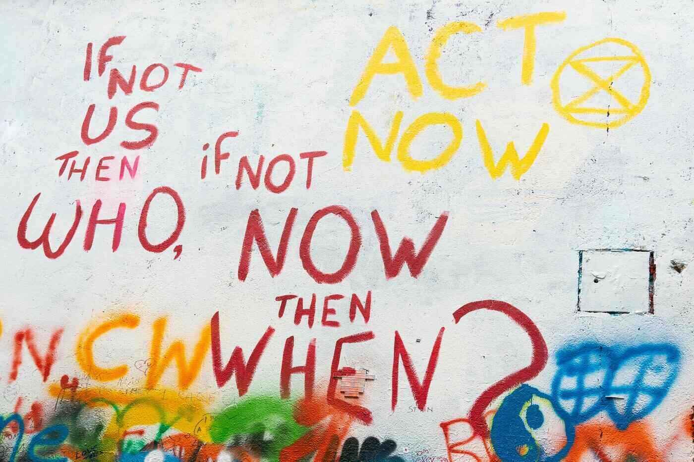 street art saying if not now then when, if not us then who - green behind the ears - climate action challenges for ordinary folks